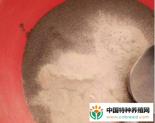 将饲料拌匀,注意,这里还没放药品,就放了水,拌匀。随后放入药品,再次拌匀