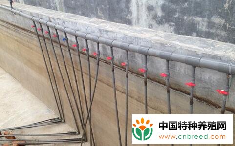 图4 增氧管:每个养殖池四周均有一排增氧管,从池底增氧,所布位置与排列很重要,开气后能使池内水循环流动,将池底残饵及排泄物等循环至池中央。