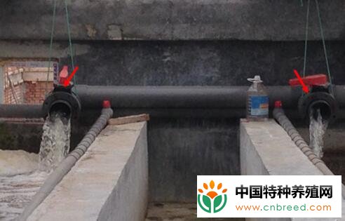 图5 进水管道:养殖池内24小时添加水,从前期放苗时水位的70~80公分陆续加深至中后期的2米深中后期保持一天换水量达到30~40公分。