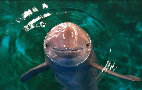 江豚没有背鳍,背部自体前五分之二至尾鳍之间有不明显的隆起,隆起上有鳞状皮肤,全身均为淡蓝灰色。