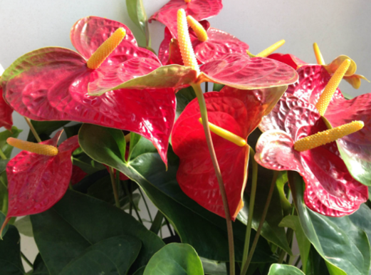 花烛是红掌的别称,这是一种花期特别长的花卉植物,它的叶片翠绿如玉,蜡质感很强,而且花色鲜红如火,就像是一朵蜡烛花一样,所以别名就叫做花烛,这是一种很受欢迎的室内花卉植物,特别容易养活。