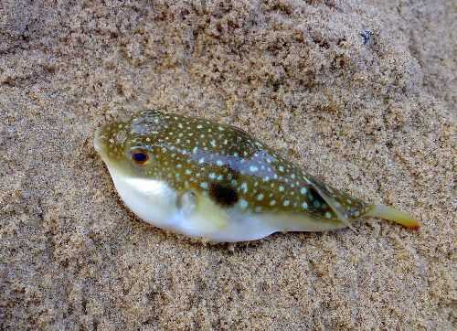 河鲀,俗称河豚。硬骨鱼纲鲀科鱼类的统称。河鲀体呈圆筒形,具有众所皆知的圆滚滚身躯,一般体长在100~300mm左右,大的可达630mm以上。上下颌骨与牙愈合成4个大牙板,体长可达1.1M。背鳍1个,无腹鳍。无鳞或有小刺。有气囊,能吸气膨胀。种类很多,大部分生活在海中,但在淡水及海、淡水汇合处也可发现。它们在水中吹动水和空气,使泥沙飞起,然后捕食躲在沙中的生物。