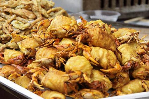 4、把在面糊中滚过的小蟹仔放入油锅中煎炸,炸至金黄捞出即可。