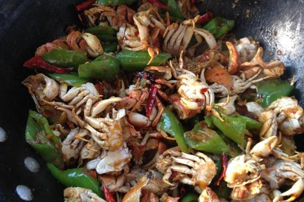 2、锅里放2大勺油,油热后,将辣椒和葱姜蒜放入锅中爆香,然后倒入小螃蟹翻炒,加入一小勺的料酒、一小勺的盐。