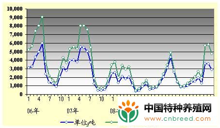 来源 2010.1-6月 2009.1-6月 进口量变化% 进口额变化% 进口量 (吨) 进口额 (百万日元) 进口量 (吨) 进口额(百万日元) 中国 2,936 4,487 3,240 4,741 -9% -5% 台湾 3,724 5,202 3,053 4,242 +22% +23% 其他 2 3 10 16 -80% -81% 合计6,662 9,692 6,303 8,999 +6% +8%2010年6月份日本加工鳗鱼进口量达2899吨,进口额47.24亿日元,都较上个月下降了19%,而与去年6月份相比,进口量和进口额分别下降34%和2%。