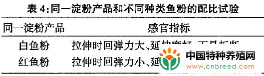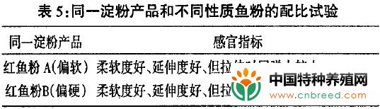 2、预糊化淀粉在鳗鱼饲料中的应用研究要确定预糊化淀粉是否适合用于鳗鱼饲料,最直观的判别方法就是和鱼粉配比做试验。鱼粉的种类不同,对预糊化淀粉的质量要求也有很大的区别。同一种淀粉产品,和不同的鱼粉做配比试验,差别很大。鱼粉一般分为白鱼粉和红鱼粉两类。白鱼粉粗蛋白质含量约为68%~70%,红鱼粉的粗蛋白质含量一般在62%以上。嘲因为白鱼粉的粗蛋白质含量普遍比红鱼粉高,其弹性要比红鱼粉好。同一种类的鱼粉,由于原料不同、加工工艺不同、质量的好坏不同,试验结果也不一样。淀粉产品和鱼粉搭配对比试验结果见表4、表5。