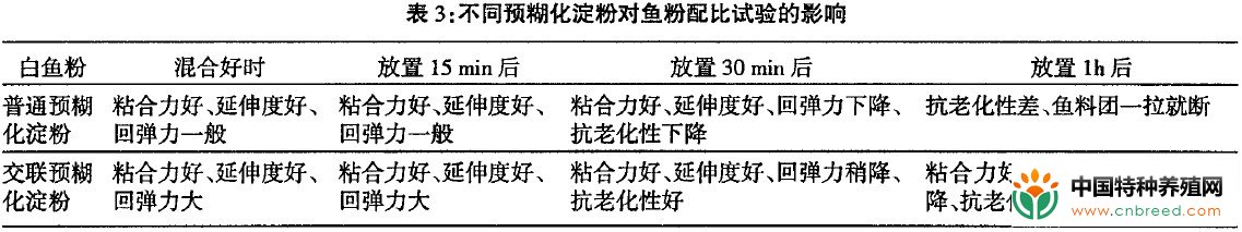 1、不同预糊化淀粉对鱼粉配比试验的影响本试验对不同的预糊化淀粉进行对比试验,预糊化淀粉与白鱼粉的比例为1:4(质量比),加入1~1.2倍的水,混合均匀。试验结果如下: