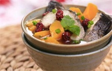 材料:黑鱼头,南瓜,红枣,调料:盐,胡椒粉,绍酒,大葱,姜,香葱,香菜