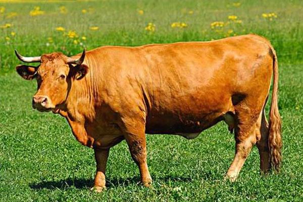 4、黄牛角弯曲、无分支、中空,内有骨质角髓,四肢匀称,四趾都有蹄甲,其后方两趾不着地,称为悬蹄,尾比较长,尾端具丛毛,毛色为黄色、黑色、杂色、红棕色、白色等,根据产地的不同被分为秦川牛、西乡牛等品种。