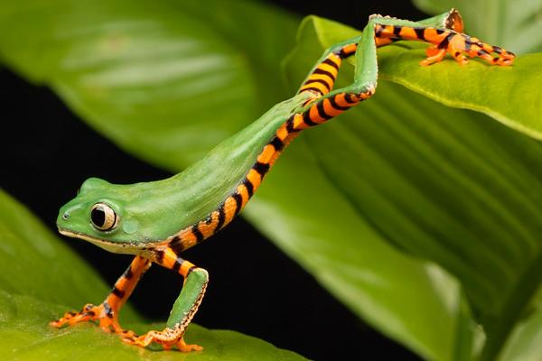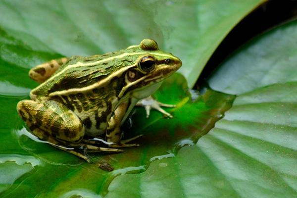 青蛙除了肚皮是白色的以外,头部、背部都是黄绿色的,上面有些黑褐色的斑纹,有的背上有三道白印。青蛙的绿衣裳是一个很好的伪装,它在草丛中几乎和青草的颜色一样,可以保护自己不被敌人发现。