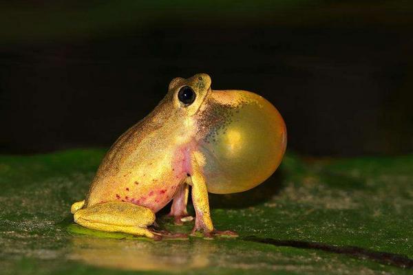 青蛙嘴边有个鼓鼓囊囊的东西,能发出声音。炎热的夏天,青蛙一般都躲在草丛里,偶尔喊几声,时间也很短。如果有一只叫,旁边的也会随着叫几声,好像在对歌似的。青蛙叫得最欢的时候,是在大雨过后。每当这时,就会有几十只甚至上百只青蛙呱呱呱呱地叫个没完,那声音几里外都能听到,像是一支气势磅礴的交响乐,仿佛在为农业丰收唱赞歌呢!