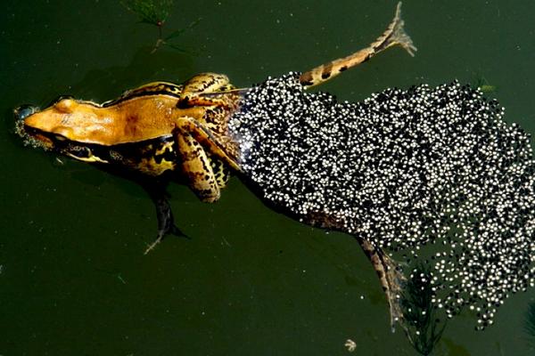 青蛙抱对产卵的时间一般1-2天,有时也长达3天。产卵一般在夜进行,黎明前为最高峰,一只50克以上的雌蛙,每次产卵在一万粒左右。