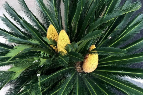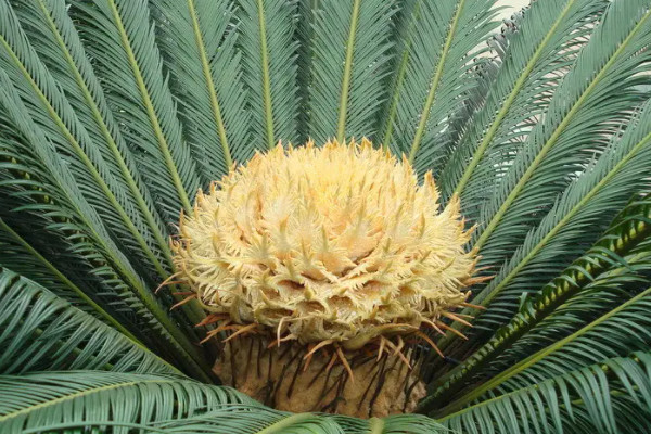铁树的雄球花呈圆柱形,长度在30-70厘米,花径为8-15厘米,小孢子飞叶窄楔形,顶部宽而平,下面中肋以及顶部被有密集的黄褐色或者灰黄色长柔毛,3个花药聚生一起。