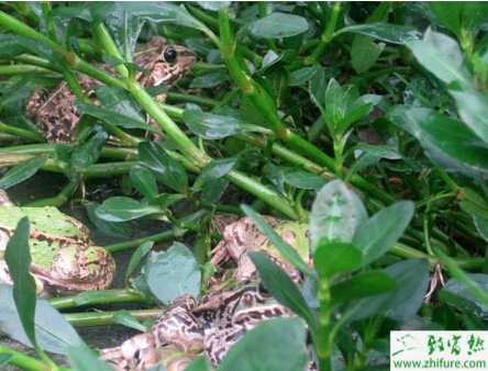 三、成蛙的饲养管理幼蛙转入成蛙池后,青蛙摄食量大,生长速度加快,是形成商品产量的重要时期,除供应充足的饵料,蝌蚪变态成蛙时即需增加动物性饲料的饲喂,主要是人工培养的蝇蛆、蚯蚓、红虫、球藻水蚤等高蛋白、高繁殖率的活饵。在活饵不足的情况下,可搭配混合饲料,如用菜子饼(粉状)60%、米糠(或麦麸)30%、大豆粉5%、鱼粉5% 配合均匀效果较好。蝌蚪活跃在水中,5天以后可供给精饲料,为豆浆、蛋黄、水蚤、空心菜、蕃茄及水中浮游生物。此外,在土堆上养蚯蚓,只要每天傍晚分片在土堆上洒上一些浓度为3~5%的石灰水,蚯蚓即会倾巢而出,充当蛙饵。还要适量喂些配合饲料,并要及时分养,调整饲养密度。成蛙饲养1个月后,蛙体重量达100克时,饲养密度每平方米30只,2个月后改为每平方米10~15只。再经短期饲养,即可成为商品蛙上市。
