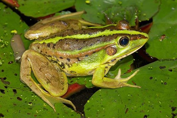 3、青蛙养殖池采用土池、砖池、稻田均可,关键在于防逃。有条件者可砌砖围墙,亦可网围,一般1~1.2米高。池中水深30~60厘米,水中央或向阳的一边堆成土堆供青蛙陆上栖息地,而且约占全污的1/3。池水中投入少量漂浮性水草。用作培育蝌蚪的池塘,只留少量陆地面积,供变态后的幼蛙登陆。蝌蚪池以水泥池为好,池壁坡度宜缓,以供蝌蚪栖息。