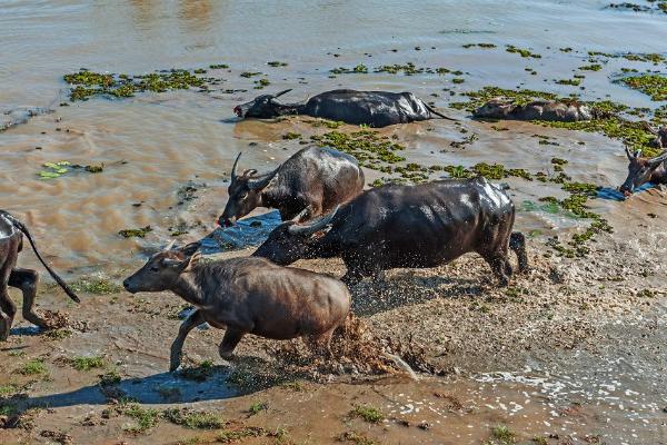 2、由于水牛的体温调节能力不强,故须特别注意防寒防暑。夏季宜给以充分浴水,由其在池塘中滚泥,身上的泥层既可防止日光直射,又能避免蚊虻叮咬。