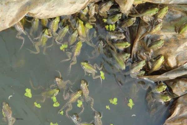 池中水深30~60厘米,水中央或向阳的一边堆成土堆供青蛙陆上栖息地,而且约占全污的1/3。土堆上种植青草或农作物。池水中投入少量漂浮性水草。用作培育蝌蚪的池塘,只留少量陆地面积,供态后的幼蛙登陆。蝌蚪池以水泥池为好,池壁坡度宜缓,以供蝌蚪栖息。