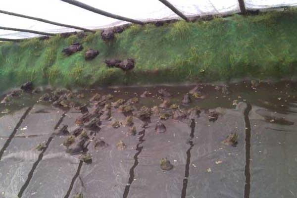 2、种蛙放养:种蛙在9~10月份放养,密度为10~12只/平米,雌雄比例1:1,种蛙在种蛙池中冬眠后来年清明节前后开始抱对产卵。