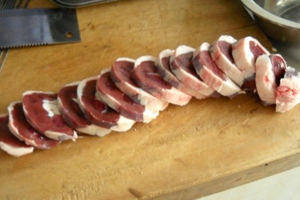 1、先剥去牛腰子外层的薄膜,然后将牛腰子对半剖开,剔去里面白色的筋,并切除深红色的部分,它们牛腰子腥味的主要来源。